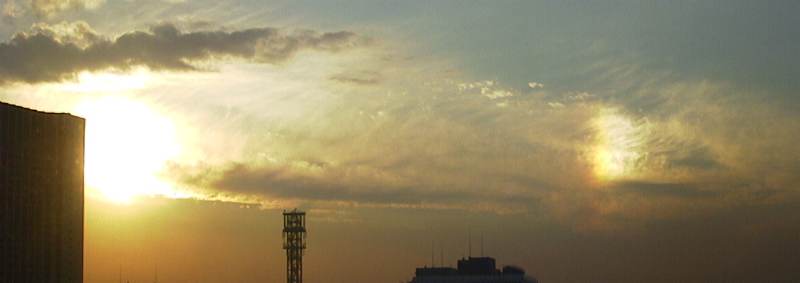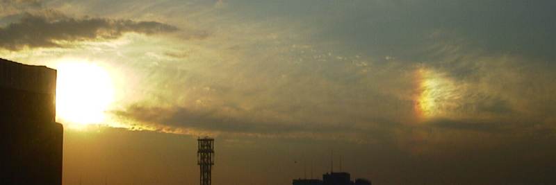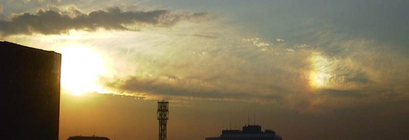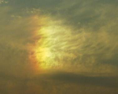 幻日現象とは、日の「笠」や虹と同種の現象で、太陽光線が雲粒で屈折して向きが変わり、太陽の水平方向にもう一つ太陽ができたかのように明るく虹色に輝いて見える部分ができる現象。太陽の水平側左右に起こり得ます。